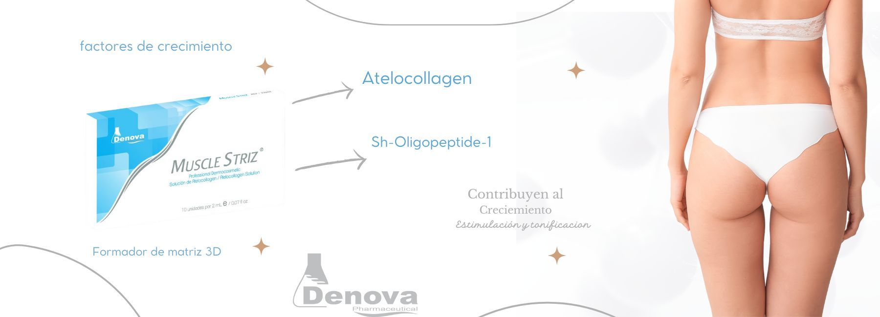 El protocolo Model Butt contiene activos como (Vitamina C, Ascorbato de Sodio, Silicio Orgánico, Atelocolágeno, Aminoácidos y Polipéptidos) los cuales actúan en sinergia brindando una reafirmación y tonificación de glúteos.